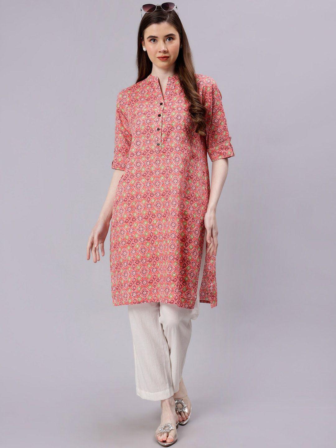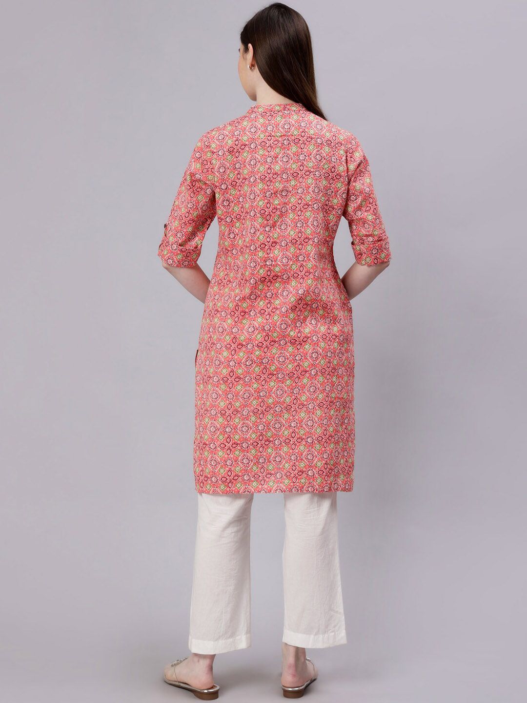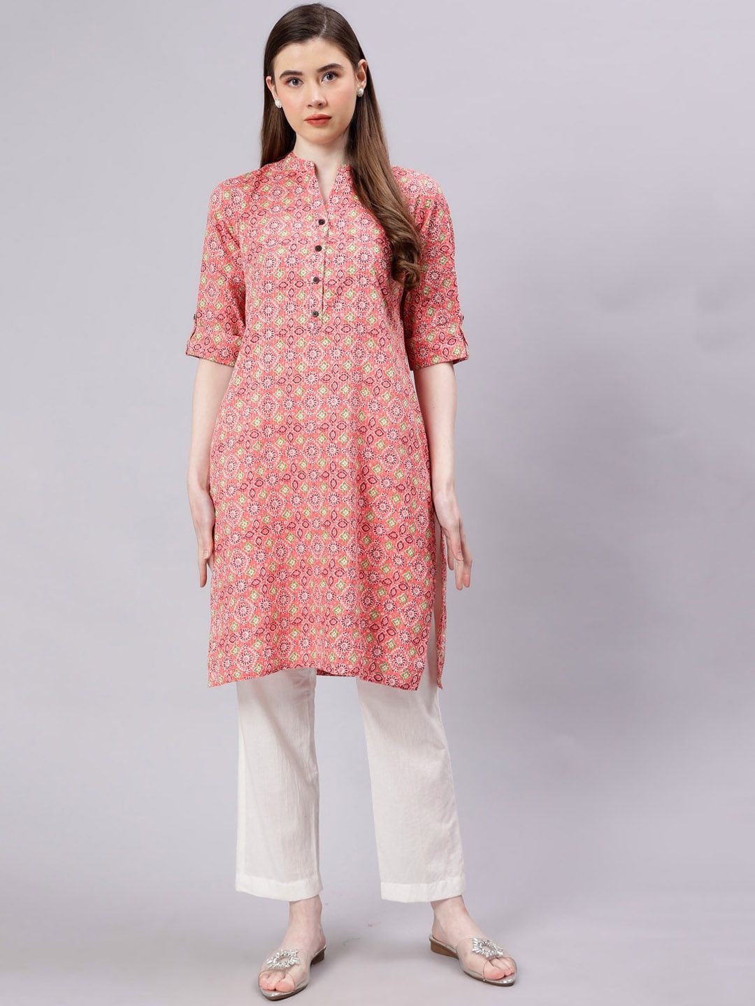 ENTELLUS Ethnic Motifs Roll-Up Sleeves Mandarin Collar Cotton Straight Kurta