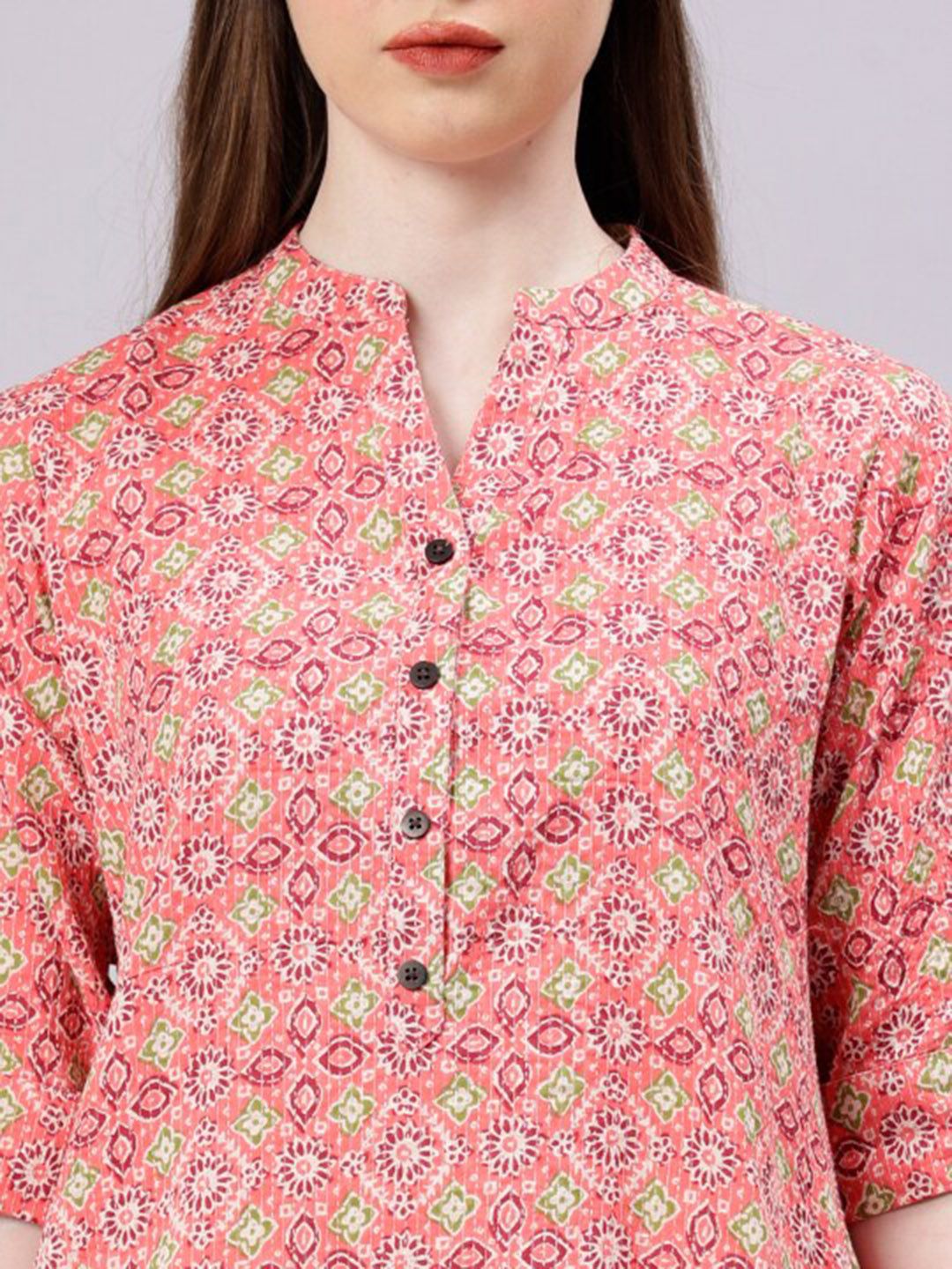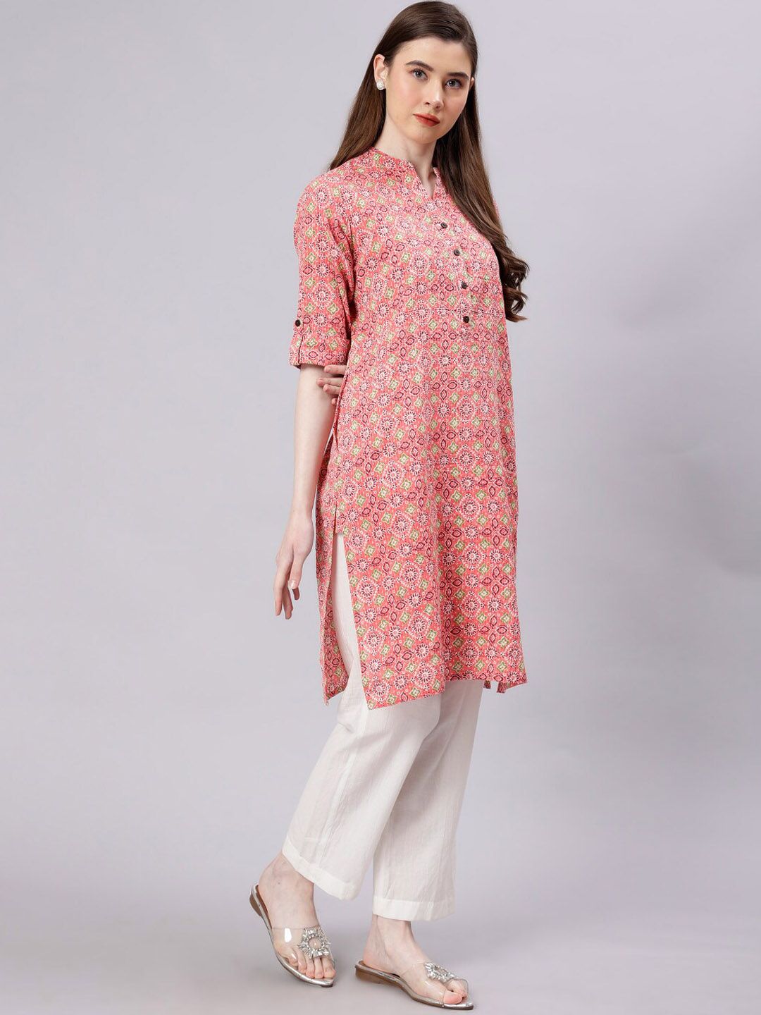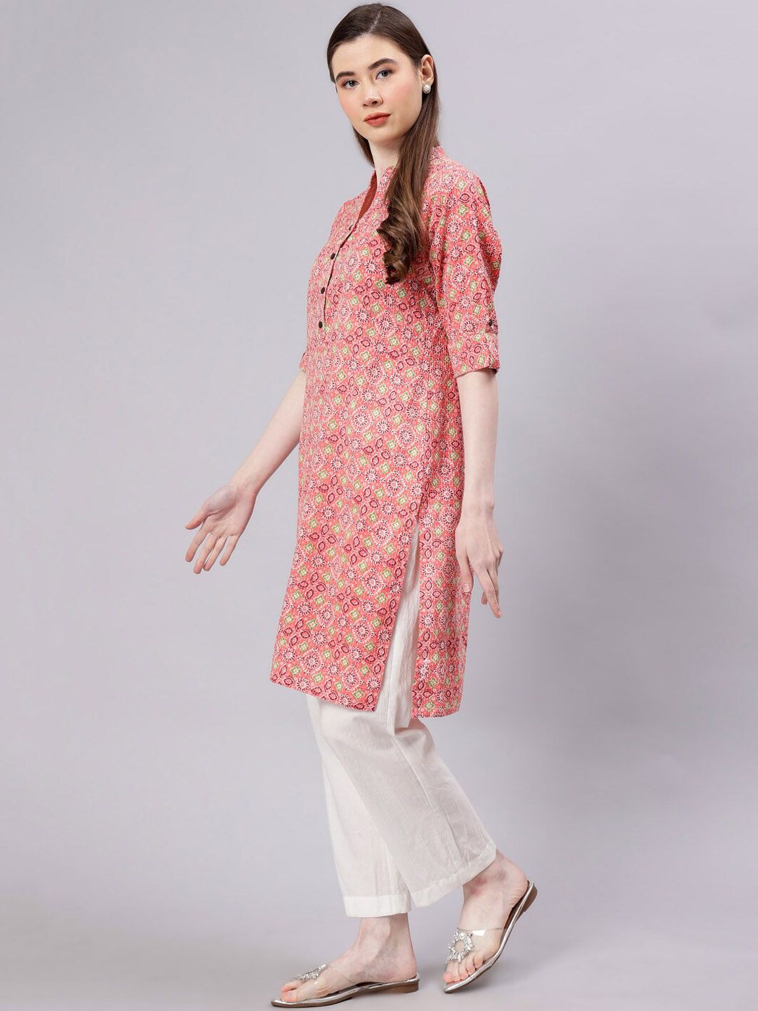 ENTELLUS Ethnic Motifs Roll-Up Sleeves Mandarin Collar Cotton Straight Kurta