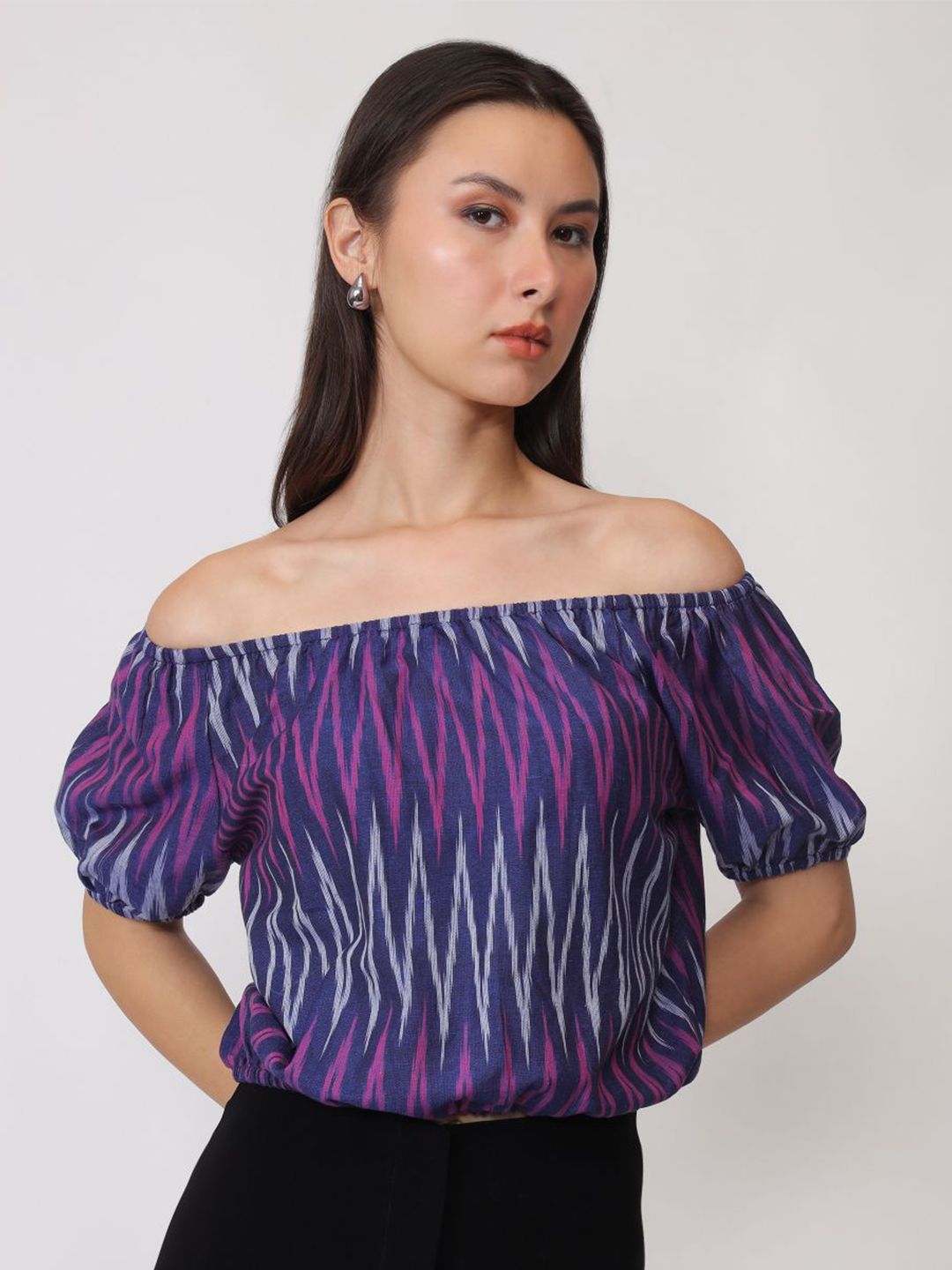 ENTELLUS Geometric Print Off-Shoulder Puff Sleeve Cotton Bardot Top