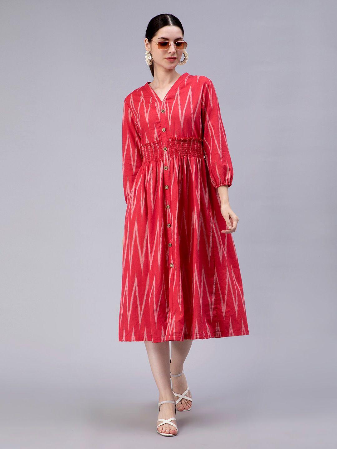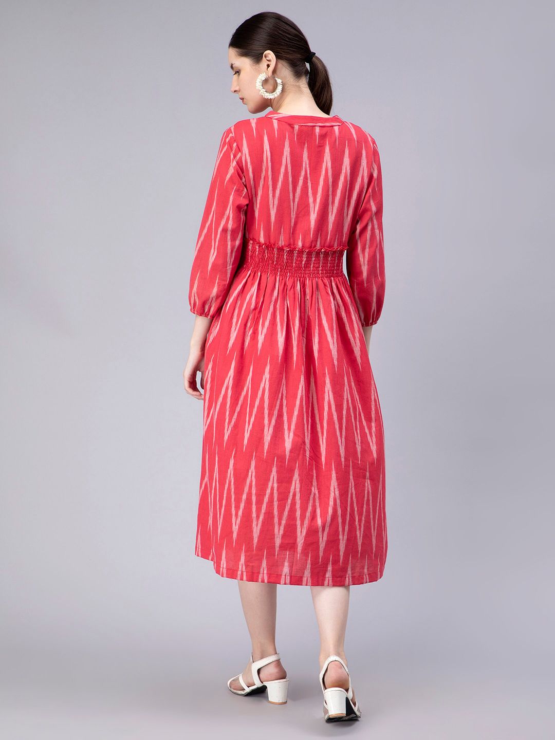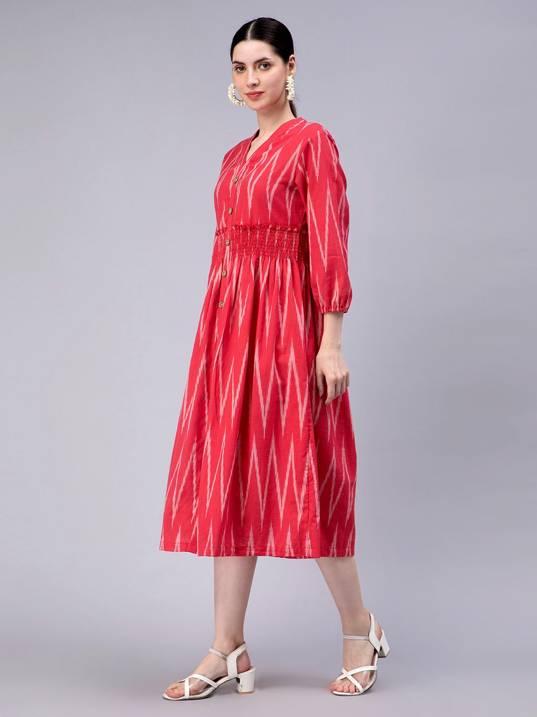 ENTELLUS Geometric Printed V-Neck Smocked Cotton A-Line Midi Dress