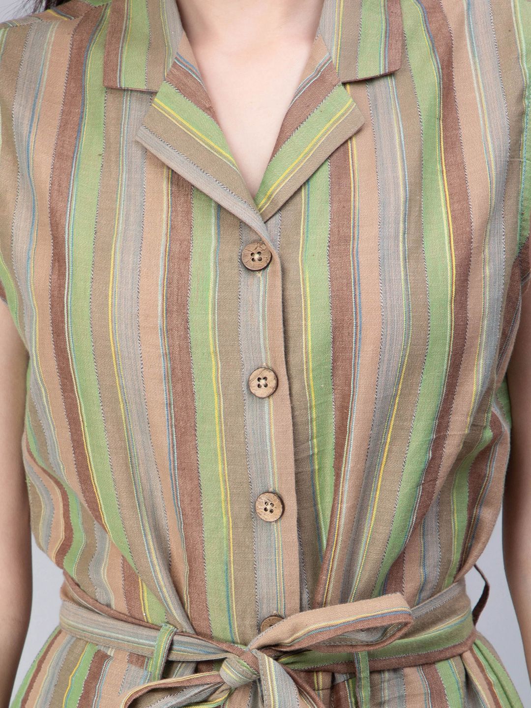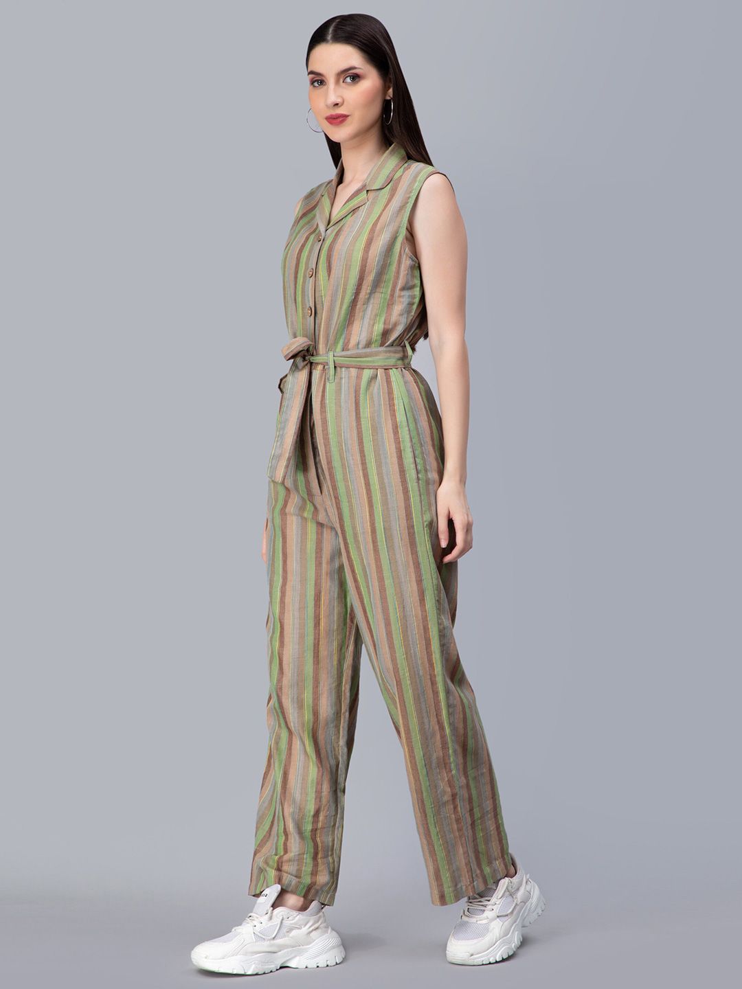 ENTELLUS Striped Cuban Collar Waist Tie-Ups Cotton Basic Jumpsuit